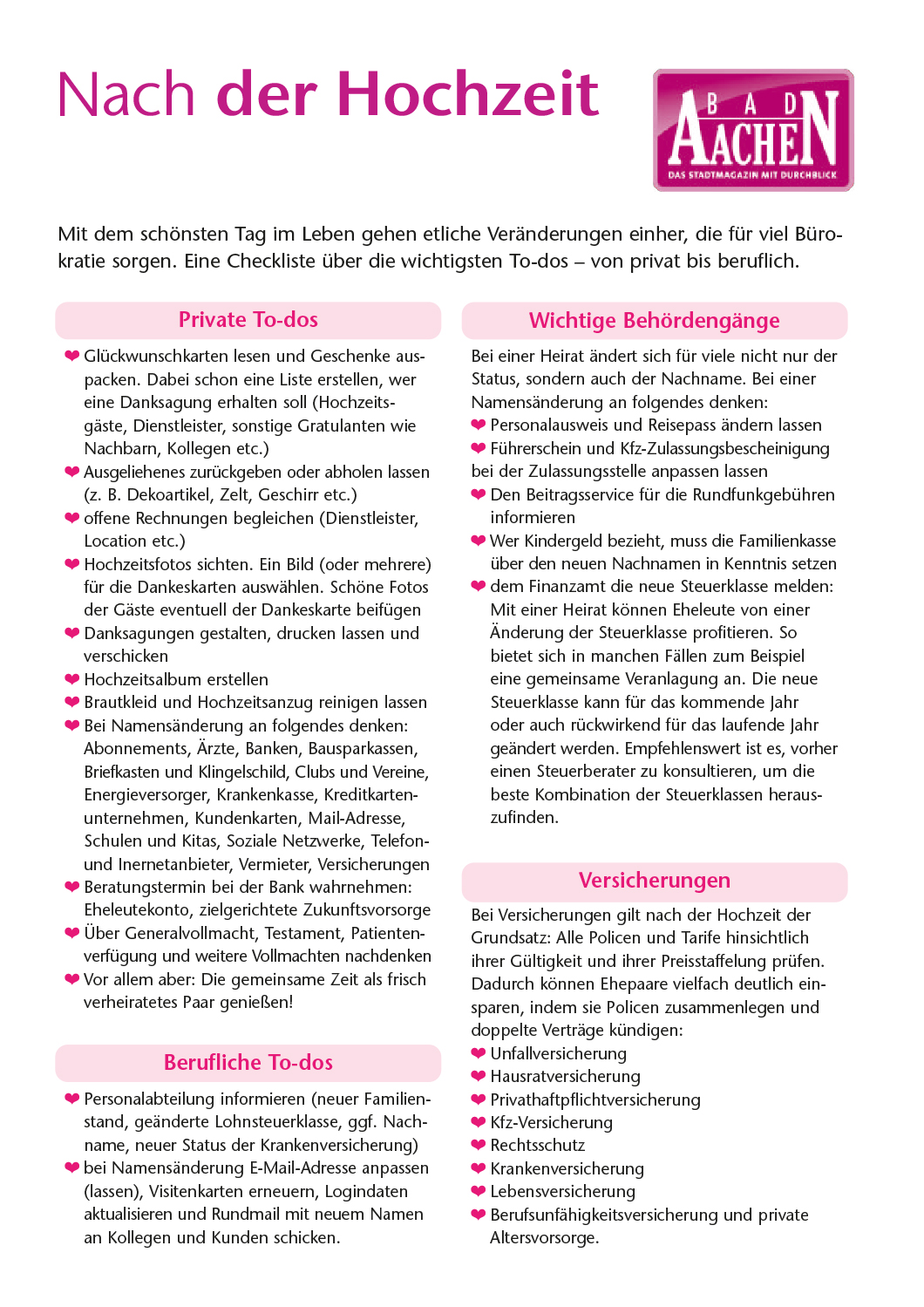 Mit dem schönsten Tag im Leben gehen etliche Veränderungen einher, die für viel Bürokratie sorgen. Mit dieser Checkliste hilft BAD AACHEN Paaren dabei, den Überblick über die wichtigsten To-dos zu behalten – von privat bis beruflich.