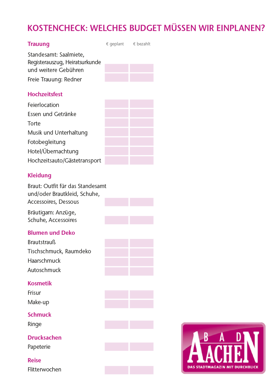 Wie ist es möglich, bei einer langen Gästeliste den Überblick zu behalten? Ist es sinnvoll, erst die Feierstätte zu buchen oder erst die Menüfolge festzulegen? Woran müssen Brautleute in den letzten Tagen vor dem "Ja" noch dringend denken? Solche und unzählige weitere Fragen stellen sich Paaren, wenn sie heiraten wollen. Aber nicht verzagen: Mit den exklusiven Planungshilfen von BAD AACHEN vermeiden die Verliebten Chaos bis zuletzt und treten völlig entspannt vor den Standesbeamten. Wer den Durchblick hat, ist eben klar im Vorteil - mit BAD AACHEN-Listen zum Runterladen!