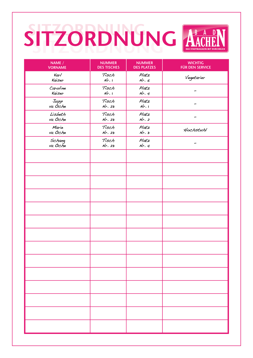 los, wer mit wem wo am Tisch sitzt. BAD AACHEN kann bei den Befindlich-keiten nicht helfen, wohl aber dabei, den Überblick